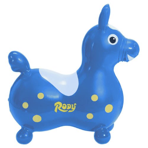 Rody Horse - An adorable, soft child's riding toy all the way from Italy to you. No need for prompting - kids hop on Rody's back and gallop about, bouncing for height and distance, testing their abilities in balance and coordination, getting a head start on developing jumping and running abilities, and smiling from here to out yonder. Parents love jumping Rody's glossy sheen, his modern shape, unique colors, and the fact that Rody can be inflated to suit changes in size and weight of children as they grow. Rody is designed especially for children ages 2 to 4, but easy to hold ears, soft vinyl and unique shape make it easy for Rody to accommodate beginning riders as well. Rody's construction of super strong vinyl can support even larger riders, so giddy-up and consider the long-term benefits of a hopping horse for an indoor or outdoor ride on toy. Rody Horses are often used in therapy for handicapped children due to their appeal to children, softness, and ride on qualities. Rody Hop On Horse by Gymnic Children's Ride On Toy Develops balance and coordination Used by therapists for developing gross motor skills Easy to hold ears, soft vinyl, unique easy to ride shape Inflatable according to the size and weight of a child Average inflated height: 12 inches at saddle Constructed of super strong, latex-free vinyl; free of phthalates Easily washed with soap and water Use of hand or foot pump recommended for inflating Made in Italy Age 2+