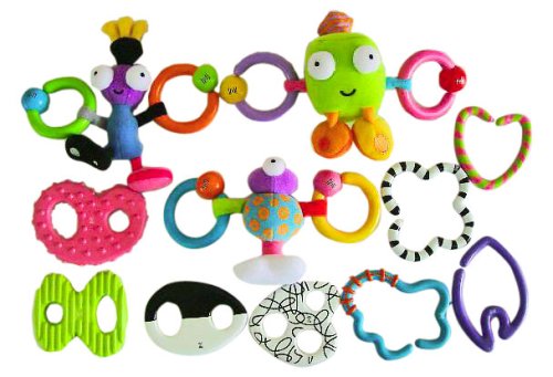 I\'ve got to admit that I purchased these links because I loved the way they looked. They have a sleek, funky style with amazingly vibrant colors that spoke to me...fortunately, my daughter (3mo at the time) thought they were pretty neat as well. They work well as car toys and teethers with several different textures on which to gnaw. My daughter still plays with them (18mo), whether it be by linking the shapes or kissing the plushies! Overall, I think their novelty has been worth the price since toy longevity is rare in our household.