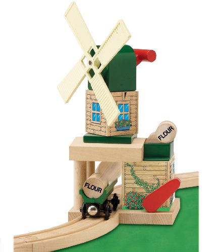 My three year old son got this as part of a train table this past Christmas. He absolutely loves playing with the windmill. An easy-to-use lever operates the windmill and another lever drops barrels of flour into the special freight car. He can play with this, by himself (key!), easily. My only issue with the windmill itself is that the tower section feels wobbly. It doesn\'t seem to be a problem for my son. Overall a wonderful addition to his train table.